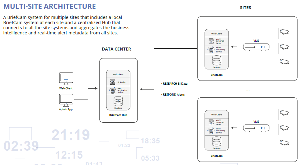 BRIEFCAM’S VIDEO SYNOPSIS SERVER: web, video streaming, data analytics and aggregation services, metadata database, video file storage, load balancing, VMS plug-ins, and user management.